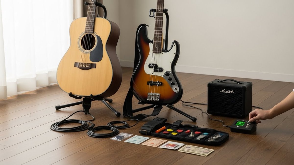 初期費用については、ギターもベースもそれほど大きな差はありません。どちらも入門用のセットであれば、本体、アンプ、シールド(ケーブル)、チューナー、ストラップ、ケースなどが揃って3万円から5万円程度で手に入ります。最近の初心者向けブランドは品質が向上しており、安価なモデルでも十分に練習を楽しむことができます。