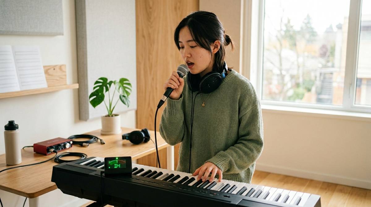 特にヘッドフォンを使って練習する場合、自分の声が遮断されすぎたり、逆に大きすぎたりすると、脳は正しいピッチ判断ができなくなります。理想的なのは、伴奏と自分の声が「6:4」程度で聞こえるバランスです。