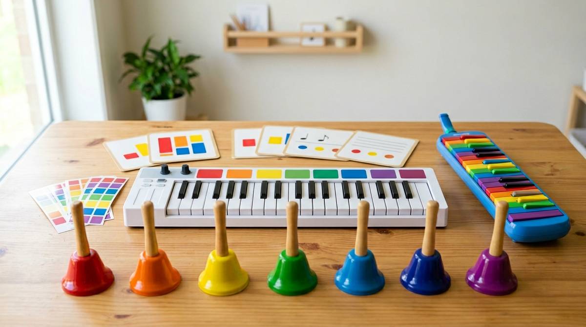 打楽器やミュージックベルであれば、色と音を紐付けるカラーコード方式のツールが効果を発揮します。